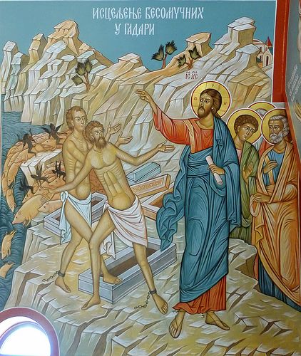 “耶稣一下船,就有一个被污鬼附着的人,从坟茔里出来迎着他。那人常住在坟茔里,没有人能捆住他,就是用铁链也不能。因为人屡次用脚镣和铁链捆锁他,铁链竟被他挣断了,脚镣也被他弄碎了。总没有人能制伏他。他昼夜常在坟茔里和山中喊叫,又用石头砍自己。