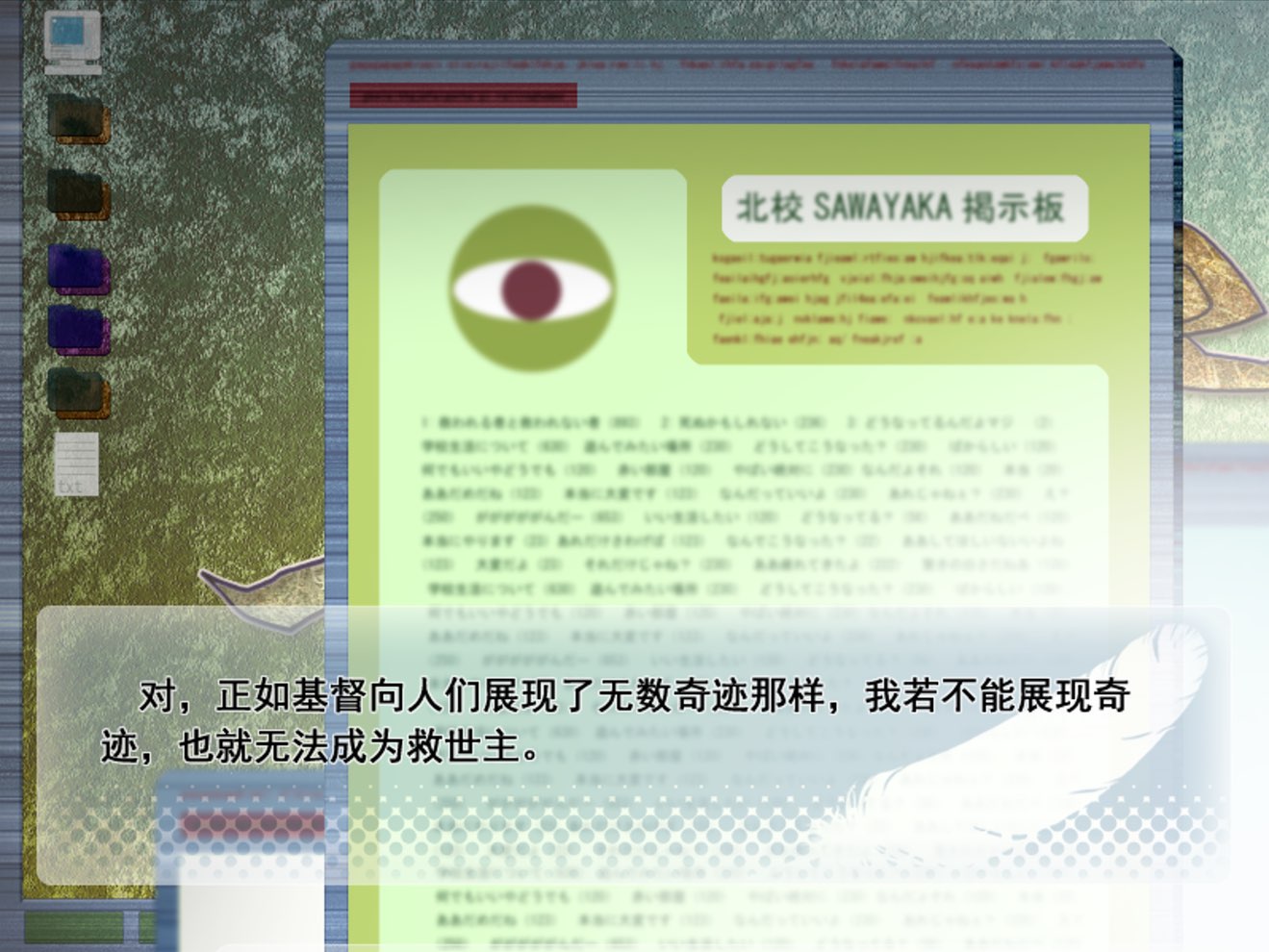 而为了证明自己神之子的虚假身份,卓司将偏执的母亲当做圣母玛利亚,而自杀的高岛拓瑠则作为发出先声的施洗者约翰,城山作为自己的正道者,西村则是被拯救的**风,老师是犯奸淫而改悔的妓女,希实香是常伴身边的使徒;所有将为此而献出生命的同学老师,都是献给天父的牺牲祭献。看似完美的安排中,却有着天大的漏洞。