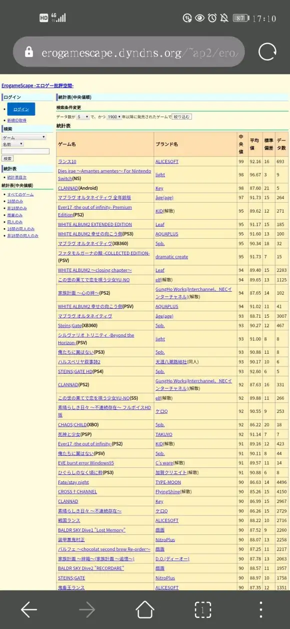 点击“中央値順”后,出现界面如下。我们可以看到统计表有6栏,分别是ゲーム名(游戏名称)、ブランド名(会社名称)、中央値、平均値標準偏差、データ数(data数,即评分人数)。批评空间排序为中央值>data数>平均值,这是因为可能存在恶意给低分/高分从而拉低/拉高平均值的情况,所以需要用中位数作参考(中位数受到极值的影响较小)。