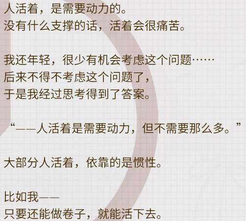 为了能够更久的活着,毕升的办法是延续自己的惯性,用每日埋头刷题来平定自己的心境,为了生存,这样的行为本身无可厚非,但实际上只是将自己变成了一台机器,失去了存在的价值和意义。