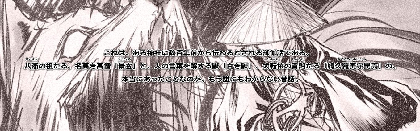 讲述了八衢之祖——名声卓著的高僧「景玄」,能理解人言的兽「白き獣」,以及太转依的首领「绮久罗美守毘卖」的故事。