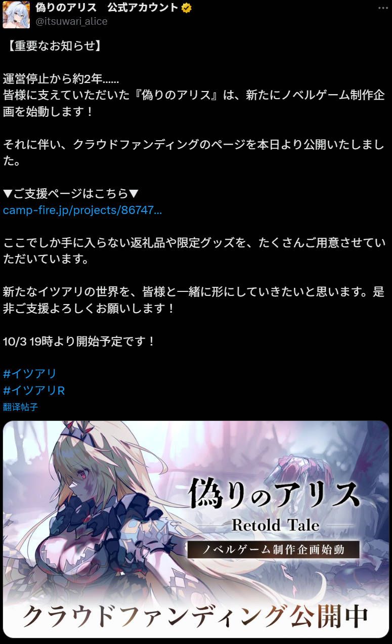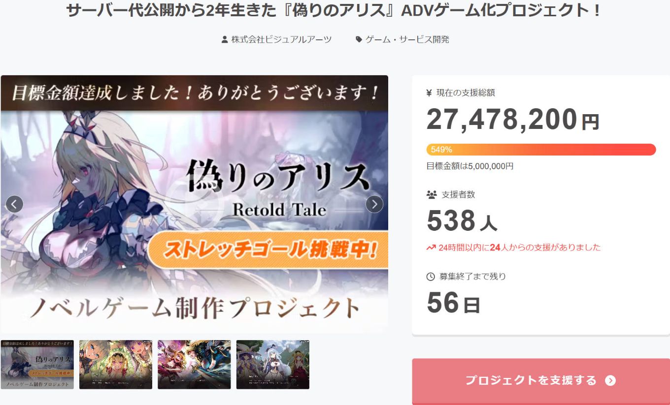 『偽りのアリス-Retold Tale-』众筹刚刚上线四分钟就达到500万円的目标,到现在已经狂斩近3000万円,看来这游戏的粉丝是真爱啊!