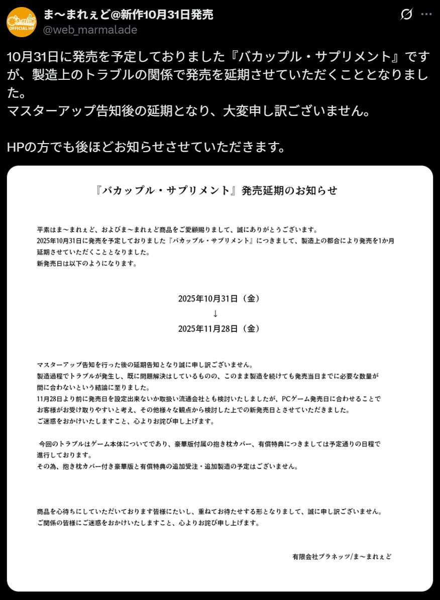 集美底子很好,但老是跳票又完全地弥补了你的优点!妈妈累宣布新作『バカップル・サプリメント』将跳票到2025年11月28日。