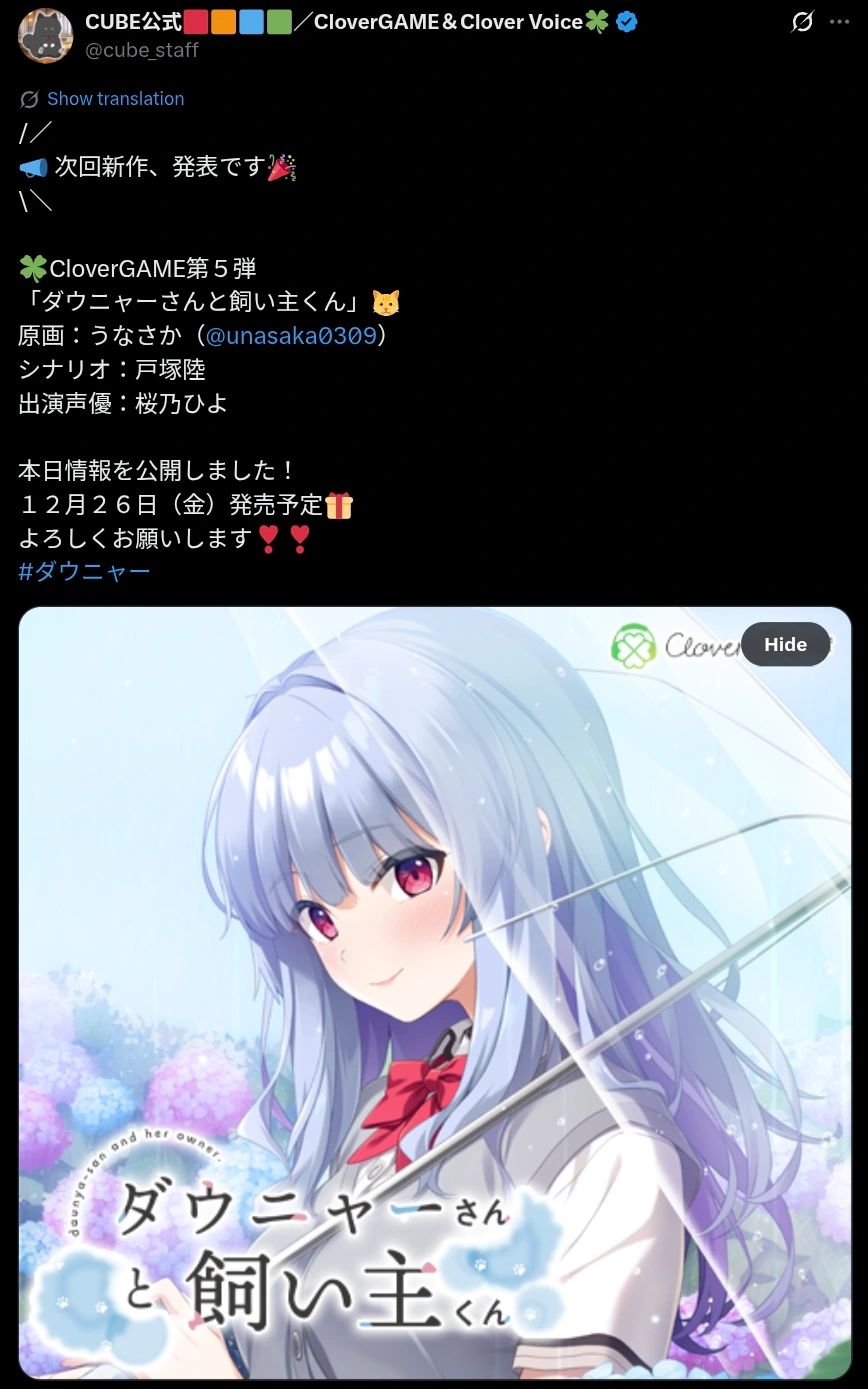 距离上一作发售才过去了一个星期,CloverGAME便马不停蹄地公布了新作《ダウニャーさんと飼い主くん》将于2025年12月26日在dlsite发售的消息。
