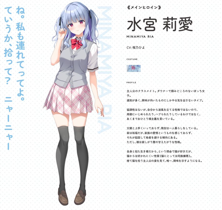 在一个下雨天,主人公笹原广斗在回家的路上,看到了他的同班同学水宫莉爱正给一只流浪猫撑伞。莉爱平时少言寡语,不愿亲近他人。然而,此时的她却天真无邪地对着猫咪说话。广斗先是向她搭话,并提议收留这只猫。