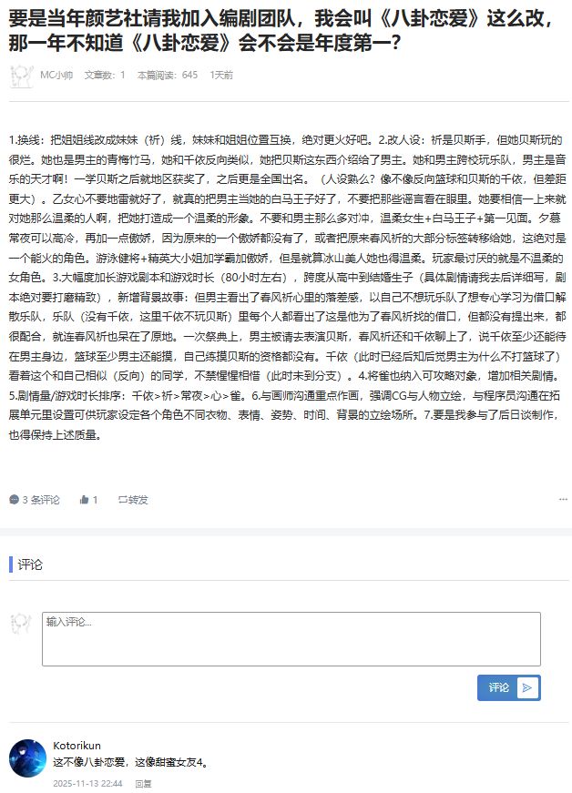1.游戏时长加到60小时,然后千岁给我去当第一女主,新・第一女主:茑町千岁核心人设:表层是 “完美邻家姐姐”,内里是 “暗恋不敢说的恋爱胆小鬼”,新增 “温柔系醋王” 标签 —— 吃醋从不是恶意争抢,而是藏在细节里的小委屈、小在意,自带 “反差萌” 又不破坏温柔底色。3 个高共情吃醋名场面(无越界行为,纯情绪流露):男主和结灯聊到深夜,回家时遇到在门口等他的千岁:她手里还攥着温好的牛奶,看到男主立刻扬起笑脸,递牛奶时却小声问 “结灯同学好像很懂你喜欢的乐队呢”,眼神飘向别处,指尖轻轻抠着牛奶盒,语气软乎乎的,没有指责只有藏不住的羡慕;班级活动上,男主帮结灯搬重物,千岁主动上前搭手,全程笑着配合,可休息时却一个人坐在角落,对着手机里和男主的童年合照发呆,被男主发现后,慌忙收起手机,红着脸解释 “只是突然想起以前你也总帮我搬东西”,耳尖红得快要滴血;男主随口提了句 “结灯做的便当很好吃”,第二天千岁就早起做了男主最爱吃的饭团,递给他时小声补了句 “我记得你小时候不爱吃太咸的,这个调味很淡”,说完就匆匆跑开,后来男主才发现,饭团里藏着他小时候最爱的海苔碎 —— 她记着他所有喜好,却只敢用 “照顾” 的名义表达在意。吃醋的核心逻辑:她的醋意从不是针对结灯,而是针对 “自己不敢告白” 的无力感,所有情绪都向内消化,对外只流露 “有点羡慕”“有点在意” 的小委屈,既让玩家心疼,又觉得她温柔又真实。