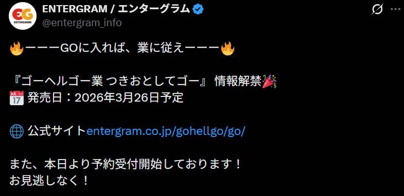 ENTERGRAM宣布《ゴーヘルゴー つきおとしてこ》的“皇家版”《ゴーヘルゴー業 つきおとしてゴー》将于2026年3月26日于NS/PS/PC发售,无中文支持。