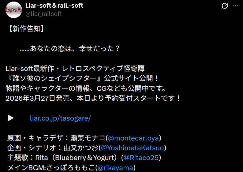 骗子社(Liar-soft)宣布新作《誰ソ彼のシェイプシフター》将于2026年3月27日在DLsite发售。