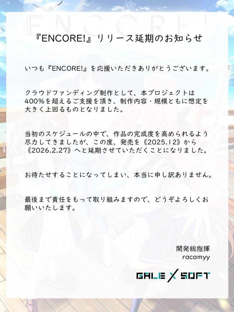 GALEX SOFT宣布新作《ENCORE!》因开发进度原因将发售日推迟至2026年2月27日。