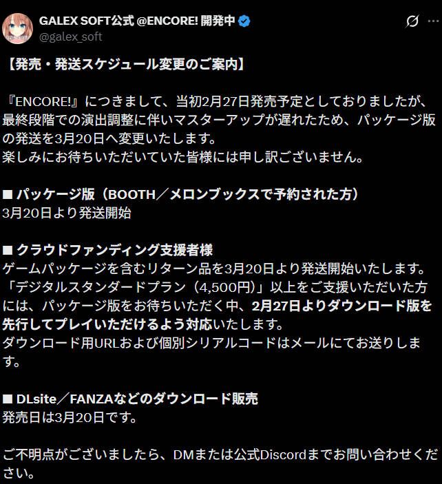 GALEX SOFT官方表示,本作在最终阶段追加演出优化,导致原定的master up延后。实体版与下载版将推迟至2026年3月20日发售。