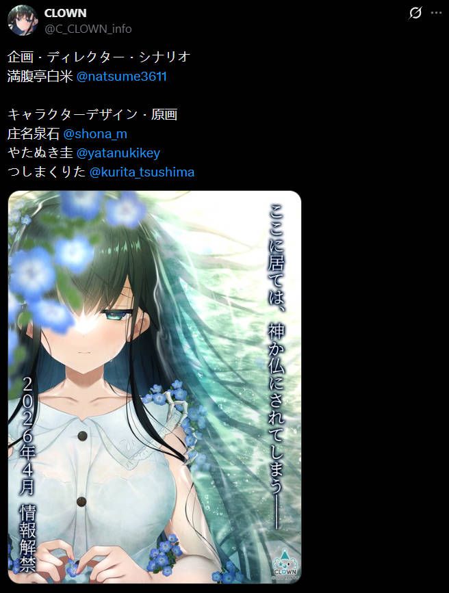 美少女游戏新品牌CLOWN在近日发布了首条推文,宣布其首部作品的预告将于2026年4月公开。