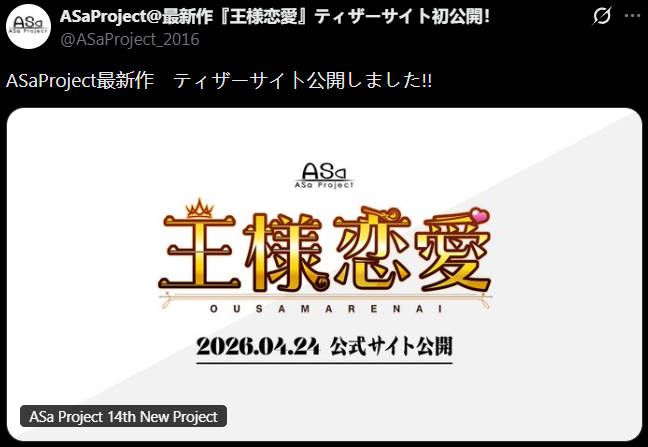 AsaProject刚刚发布了其最新作《王様恋愛》的预告,宣布游戏官网将于2026年4月24日公开。