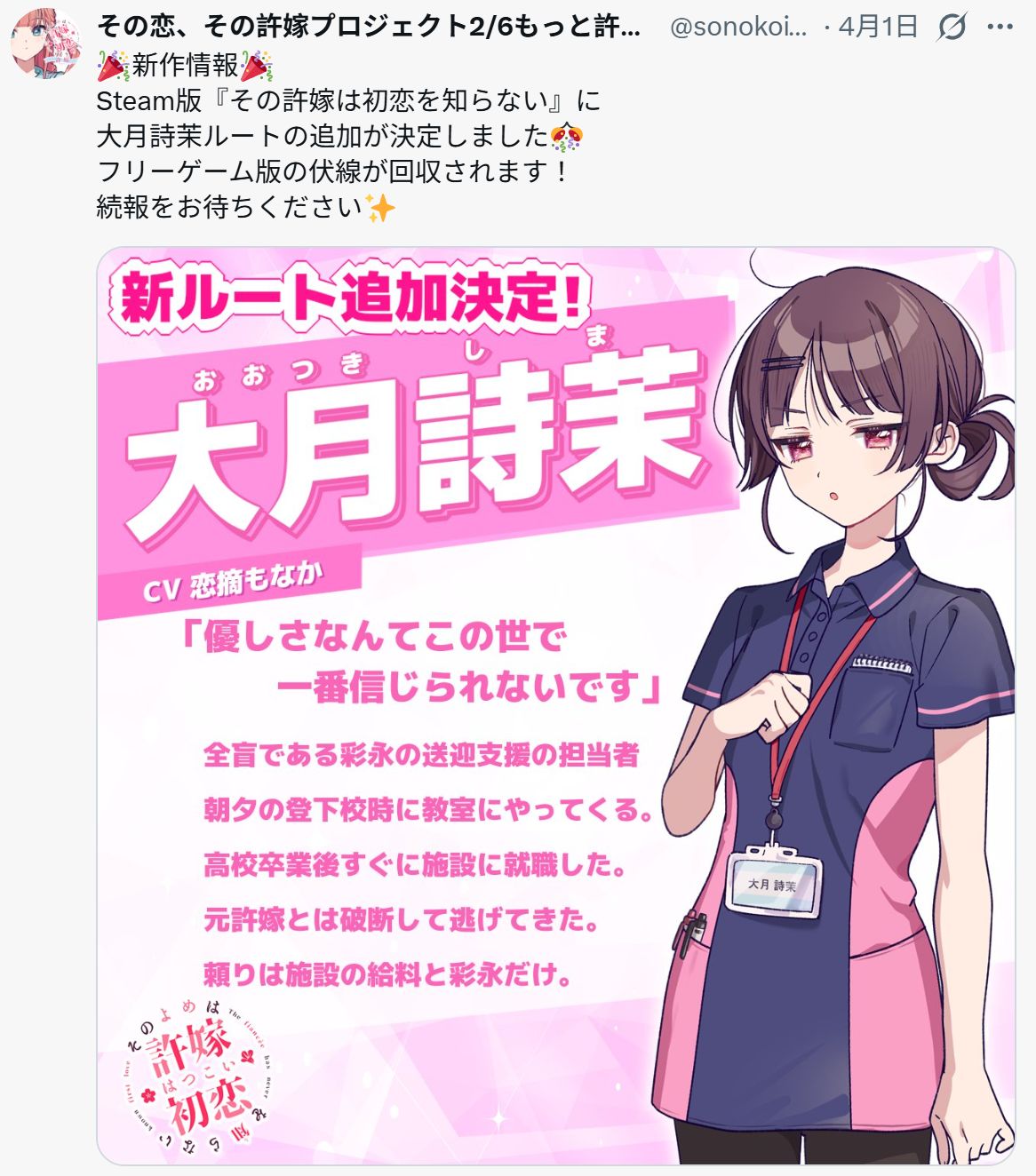 愚人节当天,由ととと。创立的同人社团“その恋、保留につき、製作応援員会” 在其官方X上同步了两项重磅消息:本作已确定将登陆Steam平台,并将正式追加角色大月诗茉的个人路线剧情。