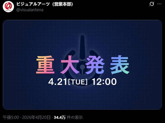 VISUAL ARTS宣布旗下新会社VISUAL ARTS Scripts将于日本时间2026年4月21日12:00进行“重大发表”。