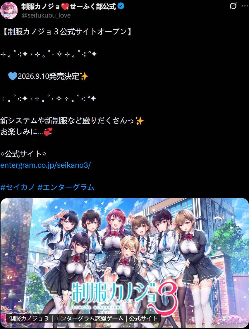 不过,以上的消息也只能算是前菜。ENTERGRAM还同时宣布了《制服女友3》将于2026年9月10日于PC/NS平台发售,目前官网已经公开。