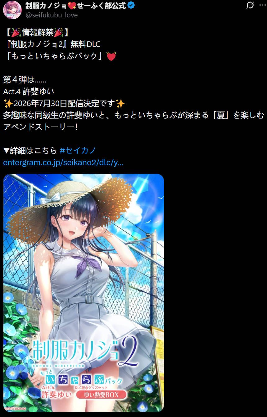 这不,财大气粗的EG直接宣布《制服女友2》第四部免费DLC许斐 唯篇将于2026年7月30日发售。