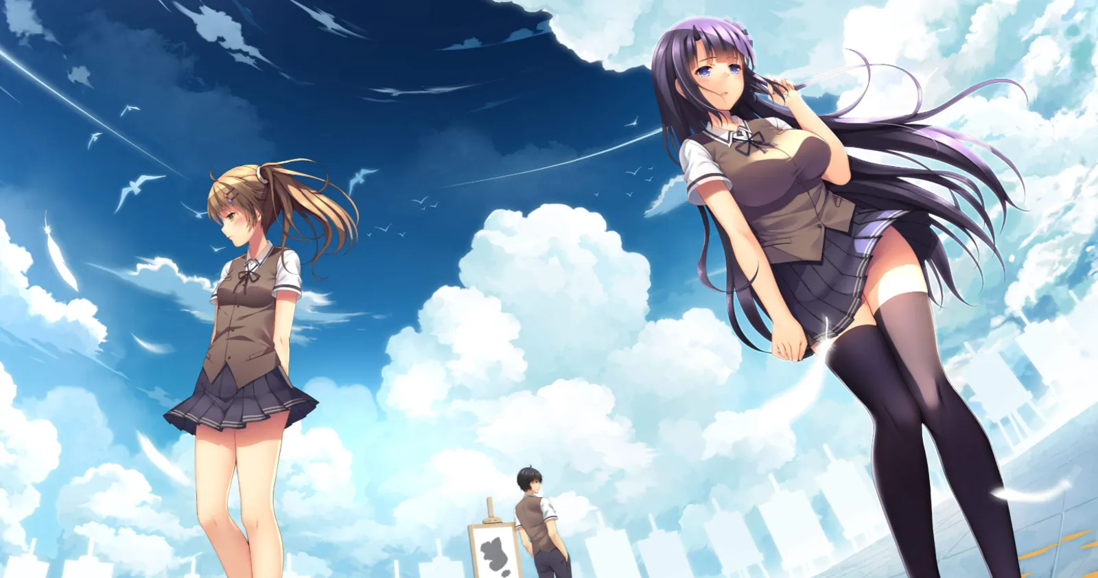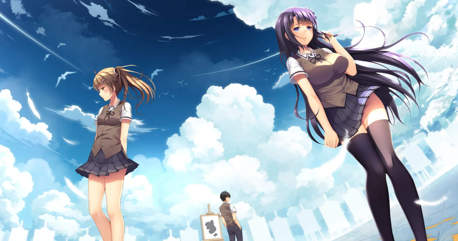 2005年,江城的暖秋。 童年有如被铁笼囚住一般,早已自觉为灰色浸染的男孩 第一次走进名为「艺术班」的教室之中。 恰巧在同桌的位置上出现的, 宛若冰山,却又似轻风薄雾的朝霞一般, 紫水晶色的她...... 被「他们」焚毁象征着同那女孩回忆的画卷时, 在炽热的火光下啜泣的, 那一抹橘色的她...... 两个色彩截然不同的少女, 同时伸出双手 ---------------相会、再会、交织、着色...... 来不及找到心中的那抹缤纷 男孩已经提起画笔 「......「一起画画」啊......」 「......嘿嘿,现在是我们三个人呢......」